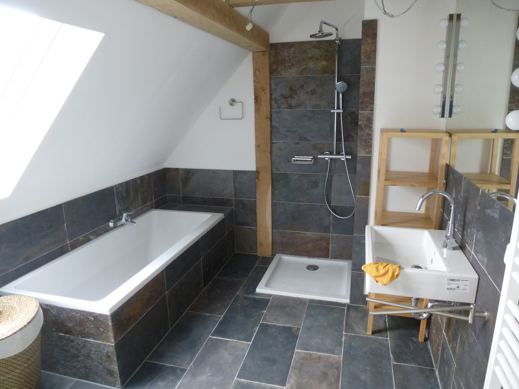 Oben links gibt es 2 Schlafzimmer mit einem Ehebett und 2 Einzelbetten, ein großes Bad mit Dusche und Badewanne und einen kleinen Hauswirtschaftsraum mit